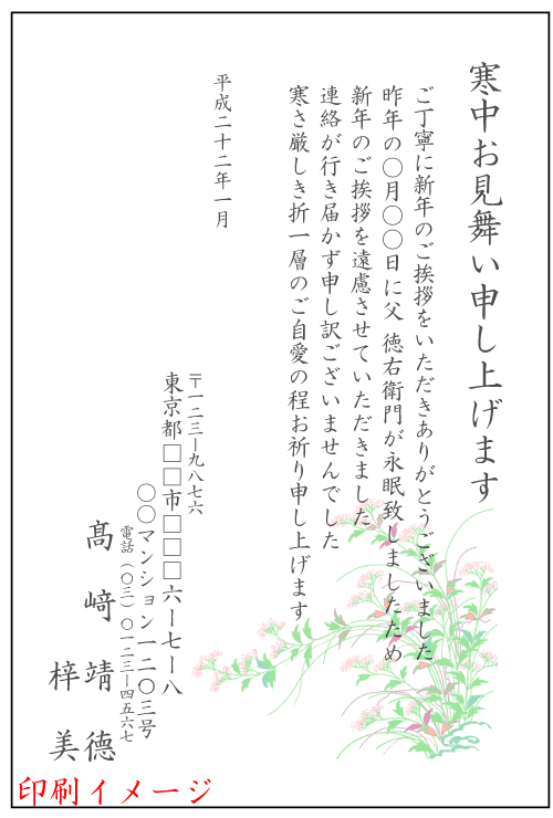 | 注文画面の最後に備考欄がございますのでそちらに下記の内容を印刷必要項目のみご記入下さい。ご逝去された月、又は月日故人との関係、故人の名前又は氏名、年齢等はがきの投函月(通常寒中見舞いはがきは1月になります。)〒番号、住所、電話番号、差出人(連名可)ワンポイントの確認ページ寒中見舞いはがきのワンポイント絵柄 寒中見舞いはがきにワンポイントの絵柄が選択できます。 図柄をクリックしますと実際の寒中見舞いはがきの印刷イメージが見られます。 01 桔梗(ききょう) 02 福寿草 03 藤袴(ふじばかま) 04 白椿(つばき) 05 蓮(はす) 06 水仙 07 紅梅 08 杜若(かきつばた) 09 柊(ひいらぎ) 10 冬景色 11 いろり 12 富士山 13 蕗のとう 14 雪割草 15 ホオズキ 16 桜 17 彼岸花 18 つわぶき 19 秋桜 20 菊 寒中お見舞いはがき 下記の文例【1〜4】よりお選び下さい。 -------------------------------------------------------------- ■ 文例1.故人の逝去月日・お名前・年齢等を印刷する ■ 文例2.故人の情報を印刷しない(故人情報無しA) ■ 文例3.故人の情報を印刷しない(故人情報無しB) ■ 文例4.喪中の情報を印刷しない ■ ■ ■ ■ 文例をお選びの上備考欄に文例番号をご記入下さい。 オリジナル文章をご希望の場合は備考欄に原稿をご記入下さい。 |